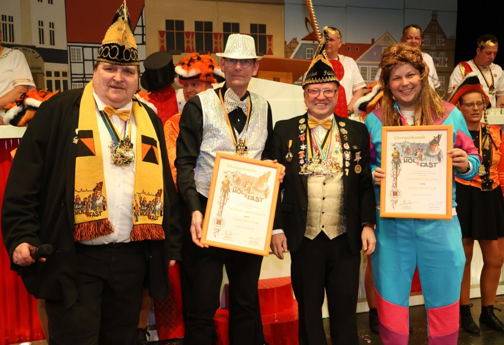 Im Rahmen des fünfstündigen Bühnenprogramms gab es für zwei der anwesenden Narren eine besondere Auszeichnung. Martin Abdinghoff von der Sparkasse an der Lippe und Philipp Gärtner, Leiter der Volksbank Werne, wurden als Dank für die Unterstützung des Karnevals in Werne zu Ehrensenatoren von „Hol di Fast“ ernannt.