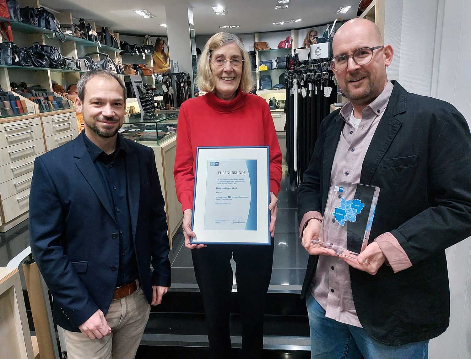 Werne. 125 Jahre „Lederwaren Küper“ – dieses Jubiläum feiert(e) das Familienunternehmen an der Steinstraße 8 in Werne 2025 mit zahlreichen Aktionen. Kurz vor Ende des Jahres gab es nun die Ehrenurkunde von der Industrie- und Handelskammer (IHK) zu Dortmund.