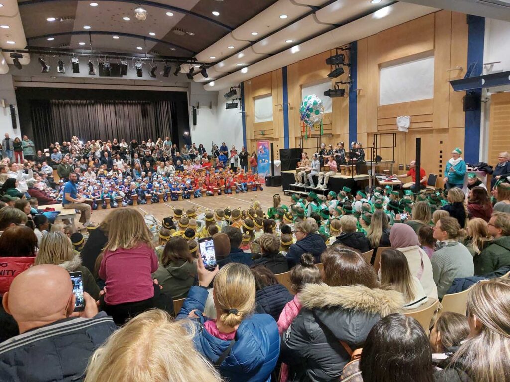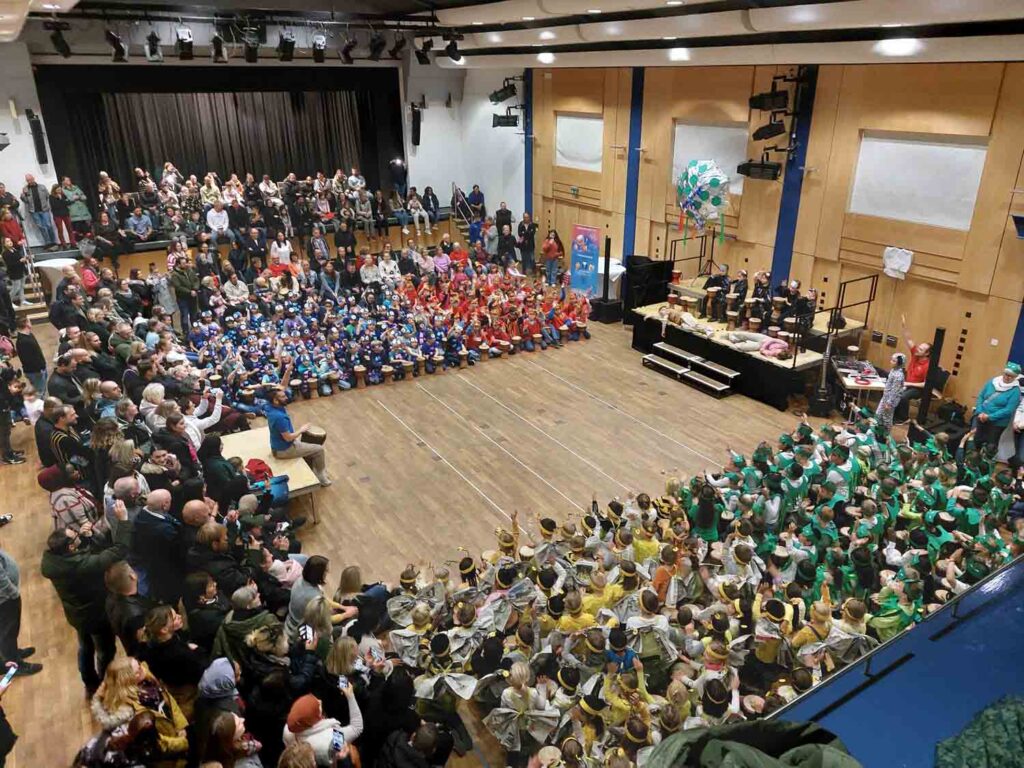Die Aufführungen fanden schließlich im großen Saal des Kolpinghauses statt, da die Schulturnhalle an der Stockumer Straße zu klein war. „Und auch dort mussten wir aufgrund der großen Schülerschaft die Gruppe teilen: Elf Klassen hatten ihre Aufführung um 14 Uhr, die verbleibenden acht Klassen um 16 Uhr. Die Kinder waren mit Feuereifer dabei, die Resonanz des Publikums – Eltern, Großeltern und Freunde – überwältigend positiv“, schilderte Nicola Buschkotte.