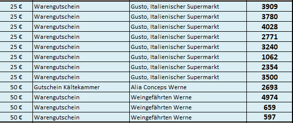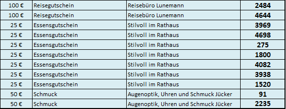 Gewinne können in diesem Jahr im Büro Blumrich, Bispinghoff & Partner, Freiherr-vom-Stein-Str. 22 in Werne abgeholt werden. Die Kanzlei ist vom 22. Dezember 2025 bis 2. Januar 2026 geschlossen. Die Gutscheine können im Anschluss ab dem 5. Januar 2026 zu den gewohnten Öffnungszeiten (Montag-Donnerstag 8-17 Uhr und Freitag 8-14 Uhr) abgeholt werden.