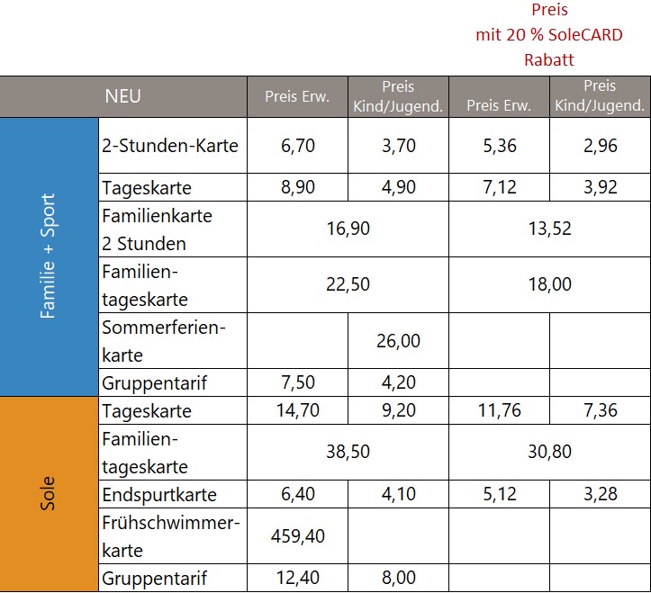 Für die Gäste bedeute dies unter anderem, dass sich der Preis für eine Tageskarte Sole für Erwachsene von bislang 14,10 Euro auf 14,70 Euro erhöht, für Kinder/Jugendliche von 8,80 auf 9,20 Euro. Die neuen Tarife treten zum 1. Januar 2026 in Kraft. Auch der Besuch nur des Familien- und Sportbads wird um einige Cent teurer. Einen Überblick über die aktuell noch geltenden Preise finden Sie hier.