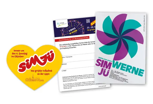 Die zweite Möglichkeit, sich ein Bummelpäckchen zu schnappen, ist die neu aufgelegte Sim-Jü-Gewinnkarte. Wie jedes Jahr erinnert das Karten-Motiv an den früheren Stadtgrafiker Karl Losch (1921–2006), aus dessen Feder das berühmte Sim-Jü-Logo stammt. Das ausgewählte Motiv stammt aus dem Jahr 1975, als Sim-Jü wie in diesem Jahr auf den 25. bis 28. Oktober fiel. Gewinnkarte vollständig ausfüllen (Doubletten werden aussortiert) und bis zum 19. Oktober im Stadthaus oder der Tourist-Info einwerfen.