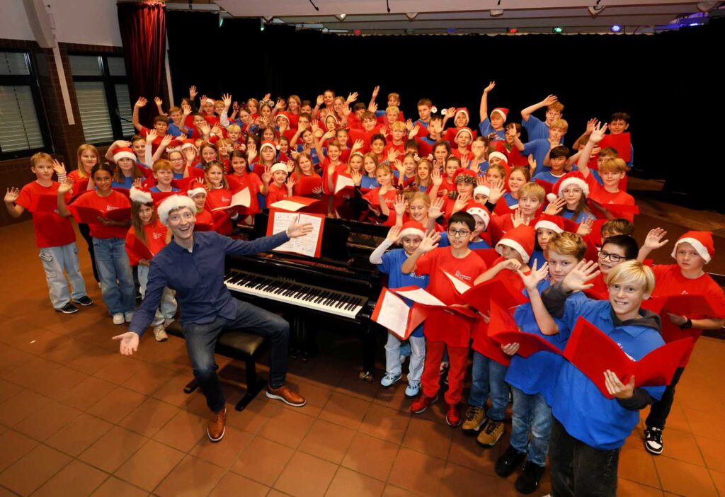 „Unser Ziel ist nicht nur der Aufbau von Gesang, sondern ebenso eine Stärkung des Selbstvertrauens der Kinder. Zudem entsteht so eine Gemeinschaft über den üblichen Klassenverband hinaus“, erklärt Andreas Lüning. Ende November und damit nach nur rund zehn Schulwochen haben die Ohrwürmer schon ihren ersten großen Auftritt beim Tag der offenen Tür mit Erfolg absolviert. Ganz traditionell galt es dabei, potenzielle neue Viertklässler und deren Eltern mit unterhaltsamen Liedern zum Thema Gemeinschaft zu begrüßen.