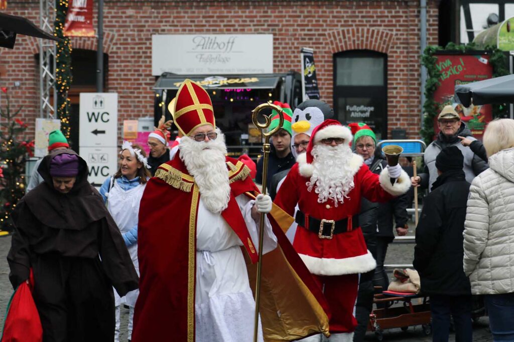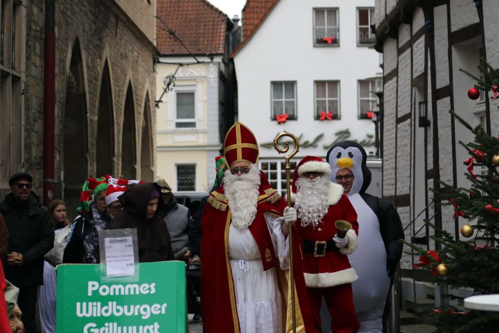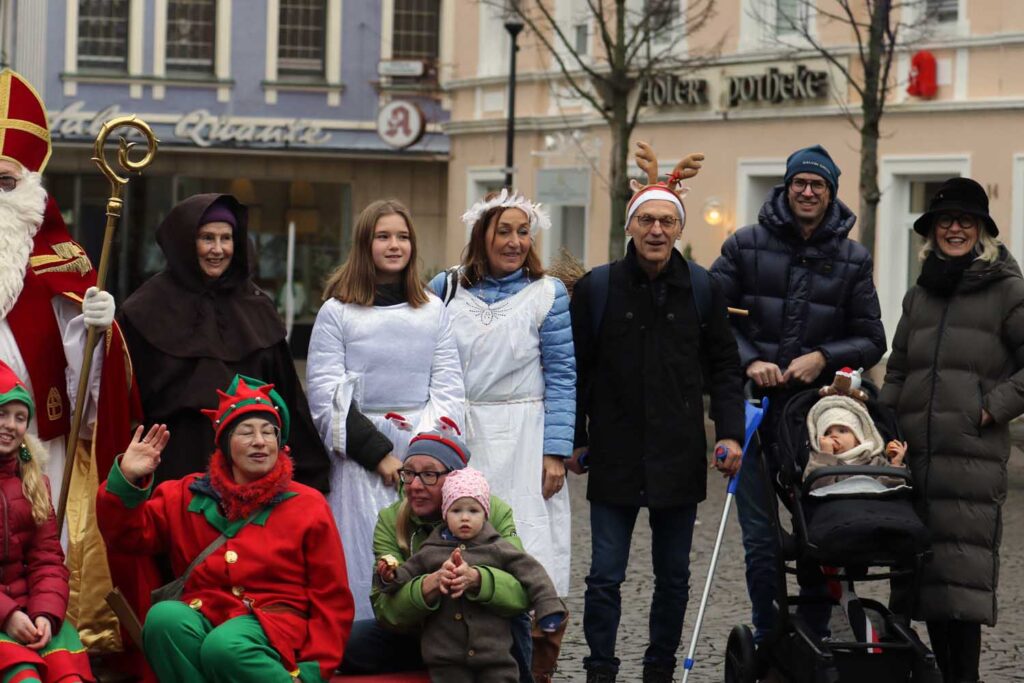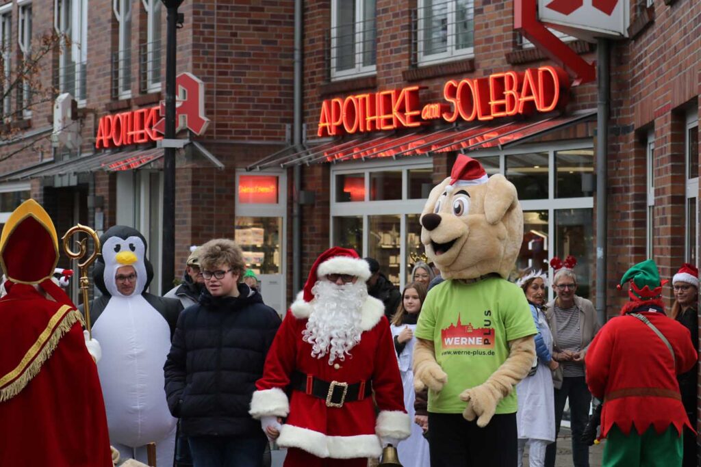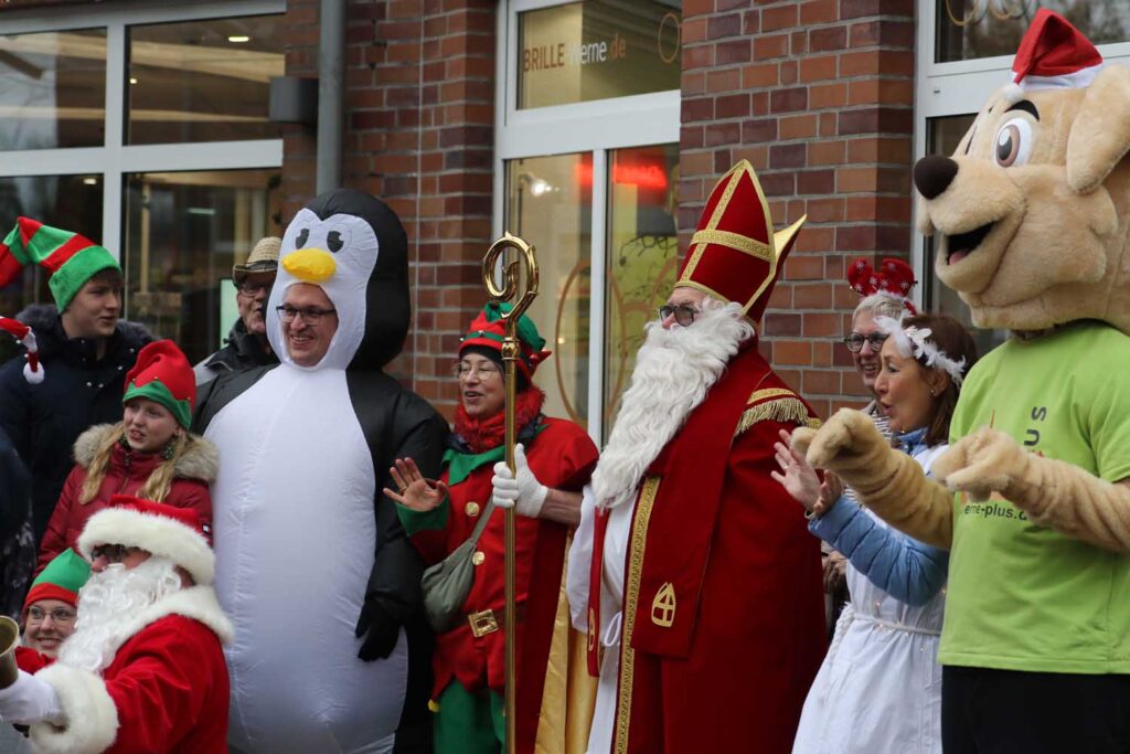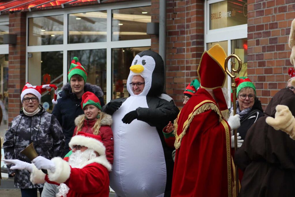 Unter anderem mit Wichteln, Engeln, Pinguin, Nikolaus und Knecht Ruprecht zogen die Weihnachtsfiguren durch die Stadt, sammelten Nüsse im Lebensmittelgeschäft Overmann oder Gebäck im Café Telgmann für ihre jungen Begleiter/innen ein.