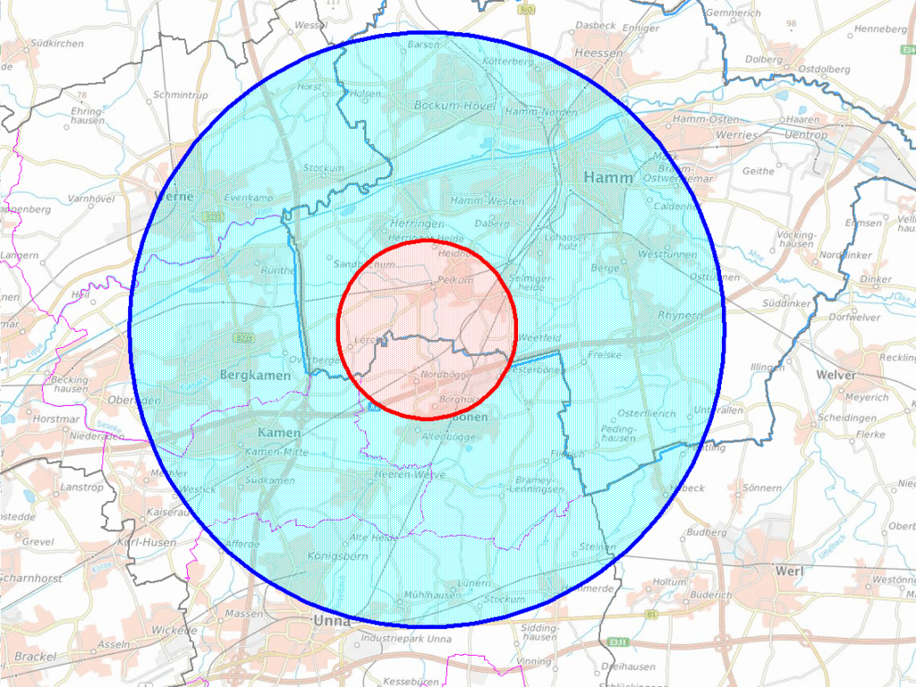 Um den betroffenen Betrieb richtet das Veterinäramt Kreis Unna, das auch für das Stadtgebiet Hamm zuständig ist, mit einem Radius von 3,1 Kilometern eine Schutzzone und einem Radius von zehn Kilometern eine Überwachungszone ein. Sie wurden per Amtsblatt am Montag, 29. Dezember, erlassen. Sie betreffen den Kreis Unna, das Stadtgebiet Hamm und den Kreis Soest.