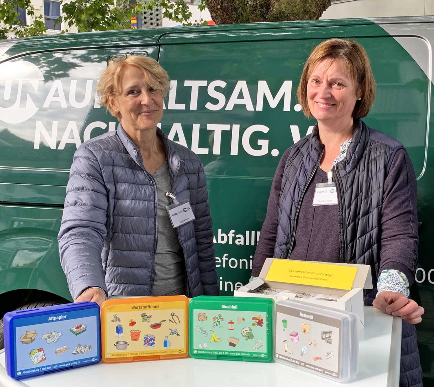 Die GWA-Abfallberatung ist auch mit einem Infostand vor Ort. Neben Informationen und Tipps rund um das Thema Abfall bietet die Abfallberaterinnen Regine Hees und Dorothee Weber auch die praktischen und kostengünstigen GWA-Serviceartikel an: Vorsortiergefäße für Küchenabfälle (Müllis), Bioabfalltüten aus Papier (Müllitüten), Inlettsäcke für die Biotonne (80 l und 120 l) und reißfeste Säcke für den Transport von Grün- und Strauchschnitt.