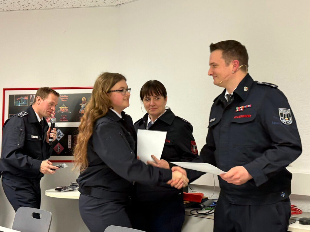 Auch die Teilnahme am kreisweiten Leistungsnachweis der Feuerwehren wurde gewürdigt. Für ihre erste Teilnahme erhielten Sydney-Rose Kauke und Marvin Klaus das Leistungsabzeichen in Bronze. Für die dritte Teilnahme wurden Simon Lembcke und Florian Schuster mit dem Abzeichen in Silber ausgezeichnet. Das Leistungsabzeichen in Gold auf blauem Grund für die zehnte Teilnahme erhielten Marcel Kuhn und Jessica Wengelnik. Für die 25. Teilnahme wurde Bele Pohlmann mit dem Leistungsabzeichen in Gold mit der Jahreszahl 25 geehrt.
