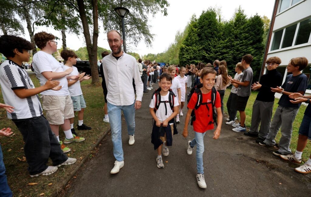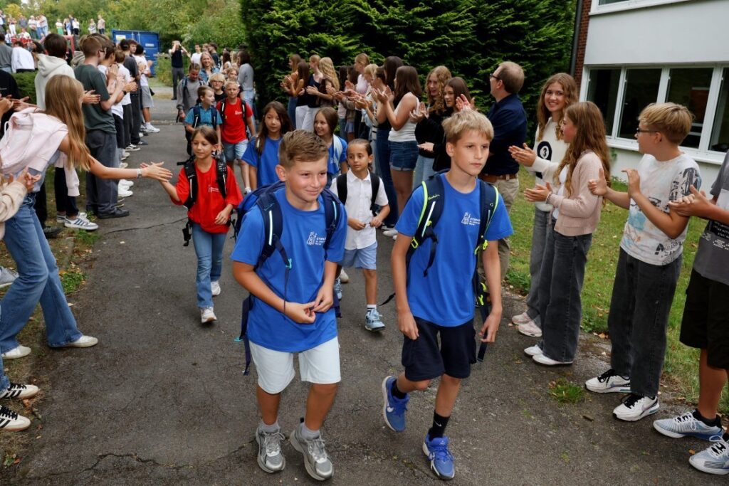 Alle Schülerinnen und Schüler des Gymnasiums hatten ihre Klassenzimmer verlassen und standen plötzlich für die drei neuen Klassen Spalier. Beim Durchzug der Neuzugänge wurde gejubelt und abgeklatscht, sodass sich die Schülerinnen und Schüler gleich an ihrem ersten Schultag sehr willkommen fühlen konnten.