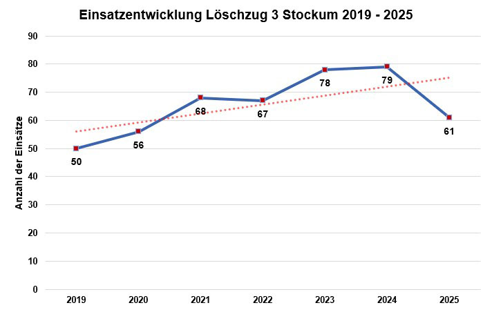 Im Jahr 2025 wurde der Löschzug zu insgesamt 61 Einsätzen alarmiert (2024: 79 Einsätze). Davon waren 24 Einsätze aufgrund von ausgelösten Brandmeldeanlagen, Fehlalarmen und sonstigen Einsätzen. 19 Mal musste der Löschzug zu Brandeinsätzen ausrücken und 14 Mal zur Technischen Hilfe. Drei Ölspuren haben den Löschzug beschäftigt und eine Brandsicherheitswache.