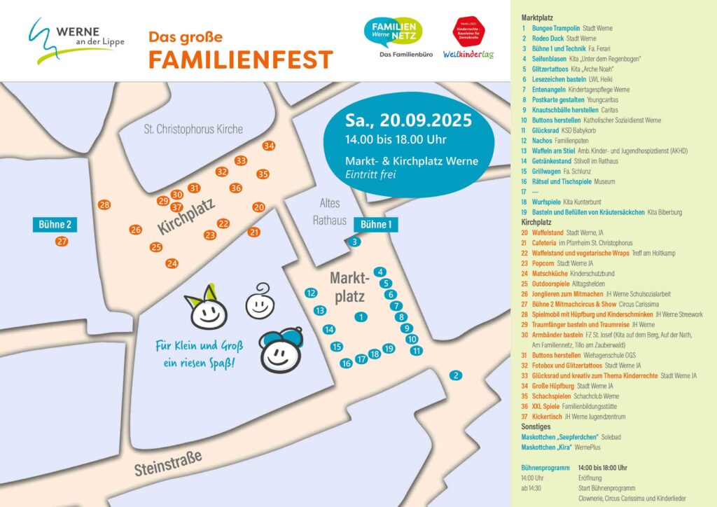 Werne. Clownerie, Musik, Gesang, Mitmachaktionen – kurz um: Spiel und Spaß stehen im Mittelpunkt, doch auch Informationen kommen nicht zu kurz: Das große Familienfest für Jung und Alt steigt wieder am Samstag, 20. September, von 14 bis 18 Uhr auf dem Markt- und Kirchplatz ein.