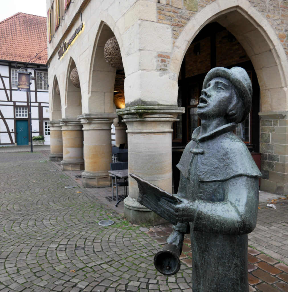 Werne. „Alle mal herhören…!“ Amtliches, Nachrichten und sonstige Neuigkeiten wurden in Werne noch bis 1914 von einem Gemeindediener mündlich unter die Leute gebracht. Auf dem Marktplatz, gleich neben dem Alten Rathaus, erinnert ein in Bronze gegossener Ausrufer mit Glocke und Schriftstück an diese frühe Art der Informationsübermittlung.
