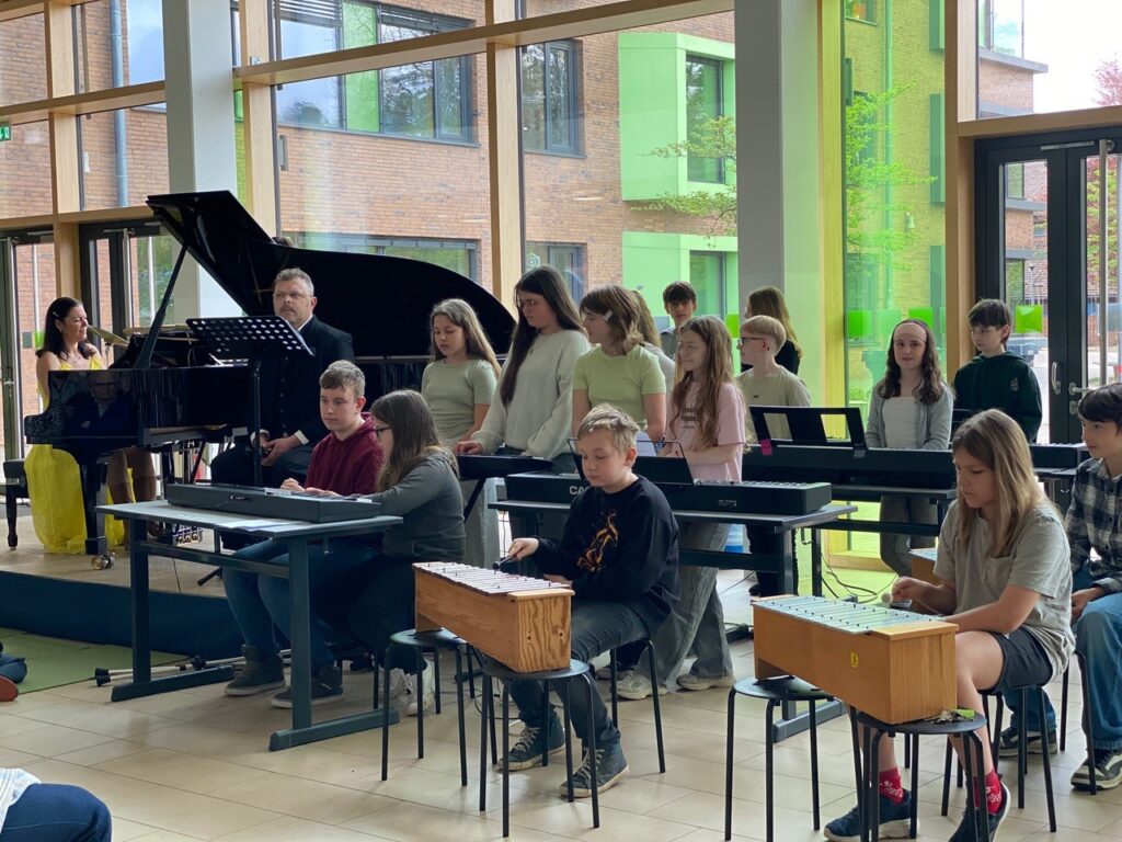 Die Pianistin Margarita Lebedkina und ihr Mann Timafei Birukov am Schlagwerk brachten die „Bilder einer Ausstellung“ zum Klingen. Unterstützt wurden sie dabei von Schülerinnen und Schülern der Musikklasse 6a der Marga-Spiegel-Sekundarschule. Diese übernahmen an Keyboards und Stabspielen einen Part des ersten Satzes, der „Promenade“.