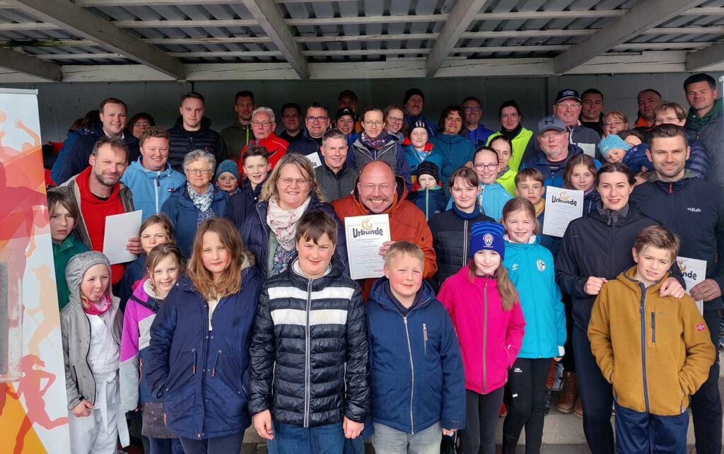 Werne. Ein Hagelschauer vermieste am Mittwoch (24.04.2024) allen Sportbegeisterten den Auftakt in die neue Sportabzeichen-Saison im Sportzentrum Dahl. Fröhliche Gesichter gab es dennoch, schließlich überreichte die stellvertretende Bürgermeisterin Marita Funhoff die Familien-Urkunden. Und das Prüferteam erhielte neue Trainingsjacken.
