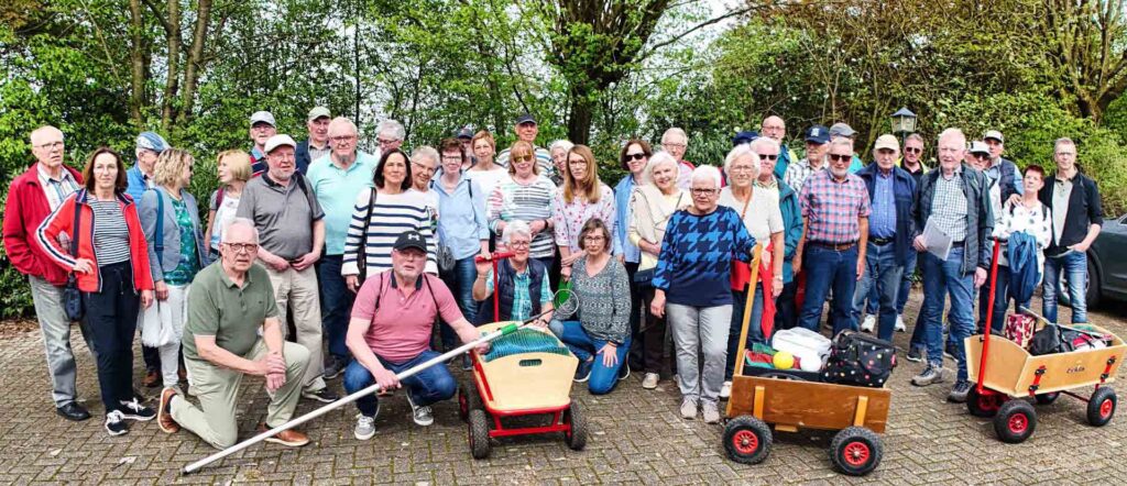 Natürlich hatten die Organisatoren für die notwendige Verpflegung unterwegs, insbesondere auch für „Zielwasser“, gesorgt, die in Bollerwagen mitgeführt wurde. Auf der Hälfte der Strecke standen Kaffee, Kuchen und Schnittchen bereit, so dass sich die Teilnehmenden in einer längeren Pause von ihren Anstrengungen erholen konnten. Als zusätzliches Highlight wurde dabei ein Einzelwettkampf getrennt für Frauen und Männer durchgeführt. Dabei galt es, mit jeweils zwei Würfen eine vorher festgelegte, aber den Werfern nicht bekannte Weite von 100 bzw. 70 Metern zu erreichen.