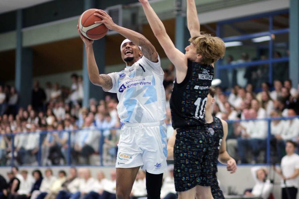 Die Ausgangslage: Mit elf Punkten Unterschied musste Werne gewinnen, um auch im nächsten Jahr in der vierthöchsten Klasse Deutschlands auflaufen zu dürfen. Getragen von den Fans in der Ballspielhalle erwischten die Gastgeber gleich einen perfekten Start. Mit einem 14:0-Run, den Junior Deumi Simo aus der Distanz und Janne Bromisch von der Freiwurflinie abschlossen, stellten die LippeBaskets auf 17:3. Als das Viertel beendet war, lag man bereits die nötigen elf Zähler vorne.